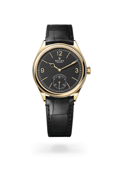 With its 3, 9 and 12 numerals and its small seconds counter at 6 o’clock, the 1908 watch, available in 18 ct yellow or white gold as well as in 950 platinum, revisits the style of an Oyster Perpetual from 1931 and resolutely endows it with modernity. The dial is a model of elegance and sophistication: Arabic numerals and faceted index hour markers in 18 ct gold against an intense white or intense black dial, or an ice blue dial featuring a guilloché rice-grain motif. Protected by a domed sapphire crystal, it features a delicate ‘railway’ minute track around the circumference. The 1908 is equipped with hands of distinctive styles: the minute hand is shaped like a two-edged sword, while a hand with a pierced circle marks the hours.
