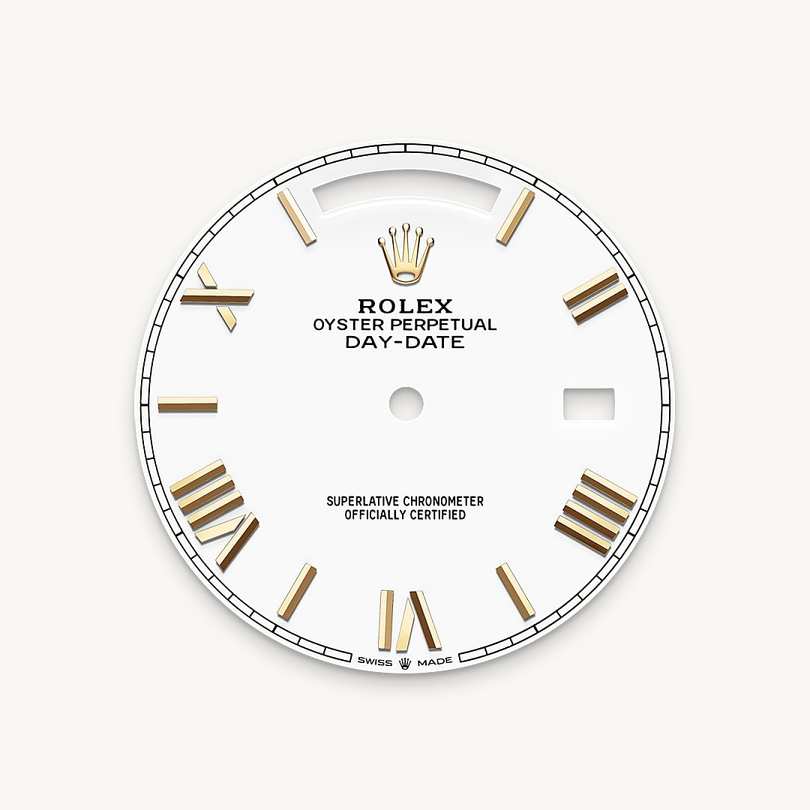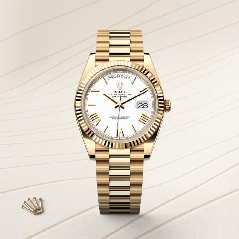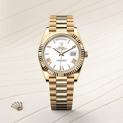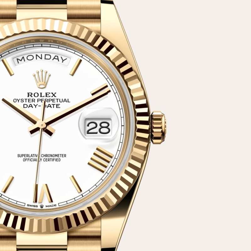The Rolex fluted bezel is a mark of distinction. Originally, the fluting of the Oyster bezel had a functional purpose: it served to screw the bezel onto the case helping to ensure the waterproofness of the watch. It was therefore identical to the fluting on the case back, which was also screwed onto the case for waterproofness, using specific Rolex tools. Over time, the fluting became an aesthetic element, a genuine Rolex signature feature. Today the fluted bezel is a mark of distinction, in gold on this Day-Date 40.