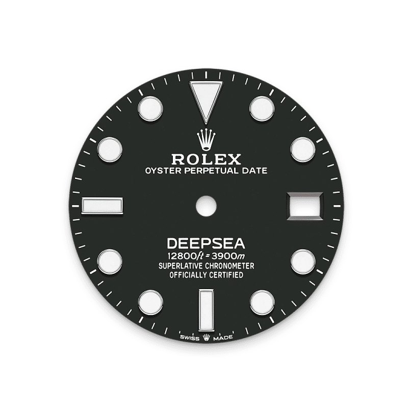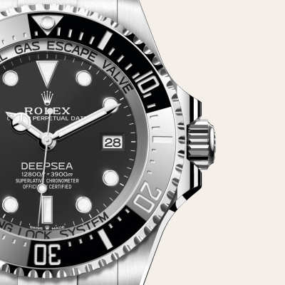 The 60-minute graduated, unidirectional rotatable bezel of the Rolex Deepsea enables divers to precisely and safely monitor their dive and decompression times. It is equipped with a patented black Cerachrom bezel insert manufactured by Rolex in a virtually scratchproof ceramic whose colour is unaffected by ultraviolet rays. The graduation is coated via PVD (Physical Vapour Deposition) with a thin layer of platinum. The dial features large Chromalight hour markers and hands, filled with luminescent material that emits a long-lasting blue glow for excellent legibility in dark conditions.