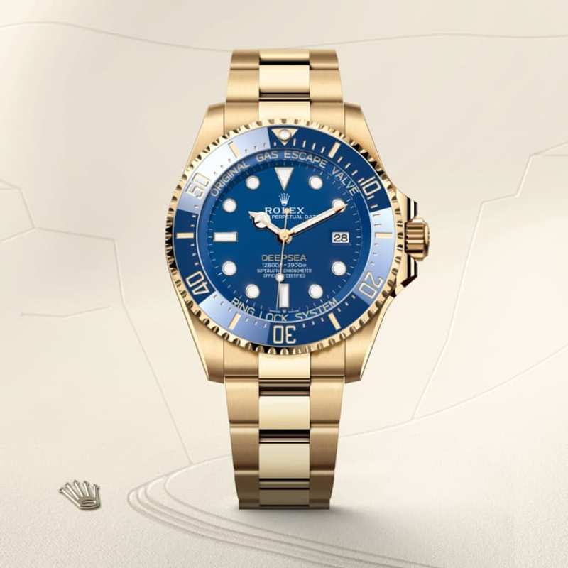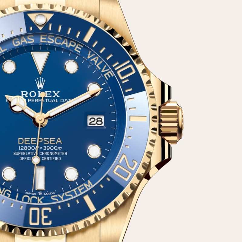 he 60-minute graduated, unidirectional rotatable bezel of the Rolex Deepsea enables divers to precisely and safely monitor their dive and decompression times. The triangular ‘zero’ marker of the graduation is visible in the dark thanks to an embedded capsule containing a luminescent material emitting a long-lasting blue glow. The graduation on the bezel is coated via PVD (Physical Vapour Deposition) with a thin layer of yellow gold. The blues found in the compression ring, the dial and the Cerachrom bezel insert combine to create a subtle oceanic palette that is accentuated by the 18 ct yellow gold of the case and the Oyster bracelet.