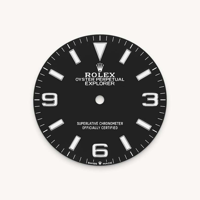 The dial is the distinctive face of a Rolex watch, the feature most responsible for its identity and readability. The Explorer model’s characteristic 3, 6 and 9 numerals are filled with a luminescent material emitting a long-lasting blue glow, like the hour markers and hands. Like all Rolex timepieces, the Explorer 36's dial is designed and manufactured in-house, largely by hand to ensure perfection.