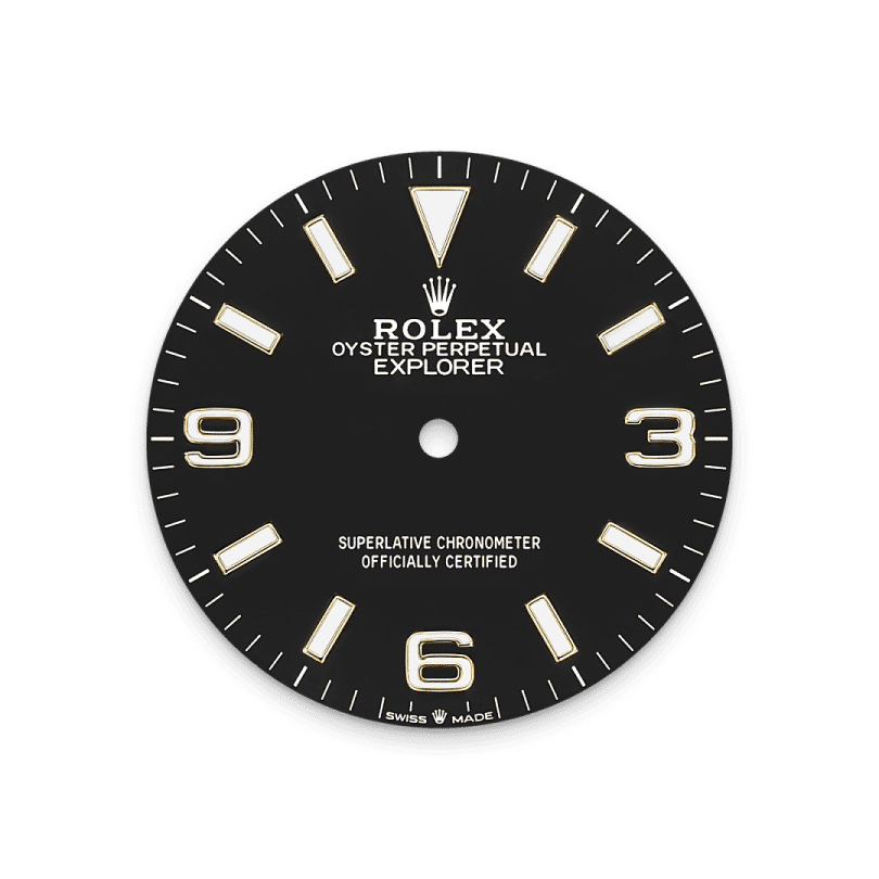 The dial is the distinctive face of a Rolex watch, the feature most responsible for its identity and readability. The Explorer model’s characteristic 3, 6 and 9 numerals are filled with a luminescent material emitting a long-lasting blue glow, like the hour markers and hands. Like all Rolex timepieces, the Explorer 36's dial is designed and manufactured in-house, largely by hand to ensure perfection.