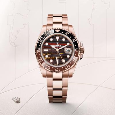This model features a tiger iron dial and a two-colour Cerachrom bezel insert in brown and black ceramic. In addition to conventional hour, minute and seconds hands, the GMT-Master II features an arrow-tipped hand, which circles the dial once every 24 hours, as well as a bidirectional rotatable 24-hour graduated bezel. The distinctively coloured 24-hour hand displays the “home” reference time in a first time zone which can be read on the graduations on the bezel. The traveller’s local time is easily set by “jumping” from hour to hour, thanks to an ingenious mechanism operated via the winding crown: the hour hand can be adjusted forwards or backwards independently of the minute and seconds hands. This allows travellers to adapt to their new time zone without affecting the precision of their timekeeping.