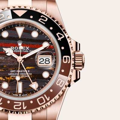 This GMT-Master II features a dial in tiger iron. This metamorphic rock, used by Rolex for the first time on this watch, is characterized by its complex structure. Composed of three minerals – tiger’s eye, red jasper and silvery hematite – it is a stone that pulses with golden and orangey tints, which, following painstaking selection and meticulous assembly, marry harmoniously with the colours of the case and bracelet.