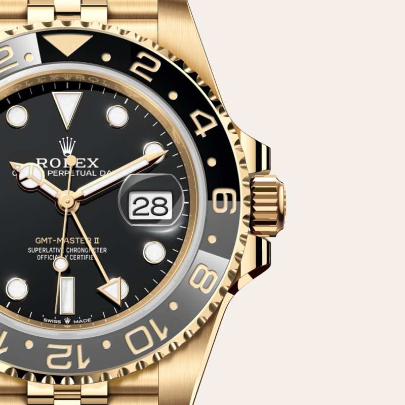 This model features a black dial and a two-colour Cerachrom bezel insert in grey and black ceramic. In addition to conventional hour, minute and seconds hands, the GMT-Master II features an arrow-tipped hand, which circles the dial once every 24 hours, as well as a bidirectional rotatable 24-hour graduated bezel. The distinctively coloured 24-hour hand displays the “home” reference time in a first time zone which can be read on the graduations on the bezel. The traveller’s local time is easily set by “jumping” from hour to hour, thanks to an ingenious mechanism operated via the winding crown: the hour hand can be adjusted forwards or backwards independently of the minute and seconds hands. This allows travellers to adapt to their new time zone without affecting the precision of their timekeeping.