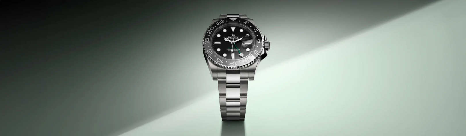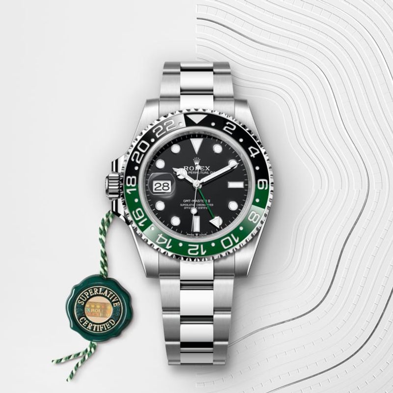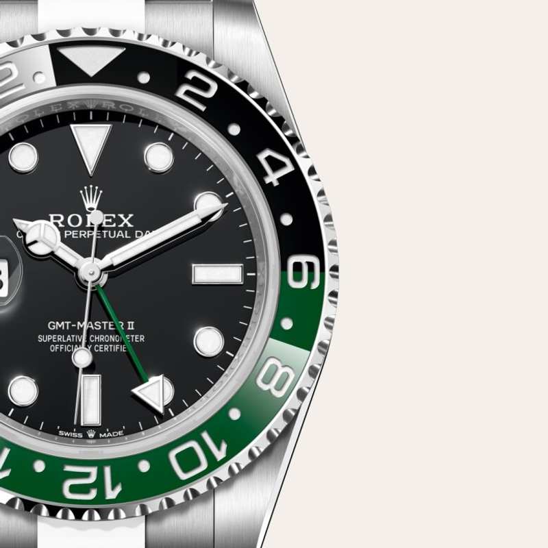 This model features a black dial and a two-colour Cerachrom bezel insert in green and black ceramic. In addition to conventional hour, minute and seconds hands, the GMT-Master II features an arrow-tipped hand, which circles the dial once every 24 hours, as well as a bidirectional rotatable 24-hour graduated bezel. The distinctively coloured 24-hour hand displays the “home” reference time in a first time zone which can be read on the graduations on the bezel. The traveller’s local time is easily set by “jumping” from hour to hour, thanks to an ingenious mechanism operated via the winding crown: the hour hand can be adjusted forwards or backwards independently of the minute and seconds hands. This allows travellers to adapt to their new time zone without affecting the precision of their timekeeping. The Cerachrom bezel insert features an original colour combination: black and an exclusive green that is reserved for this model.
