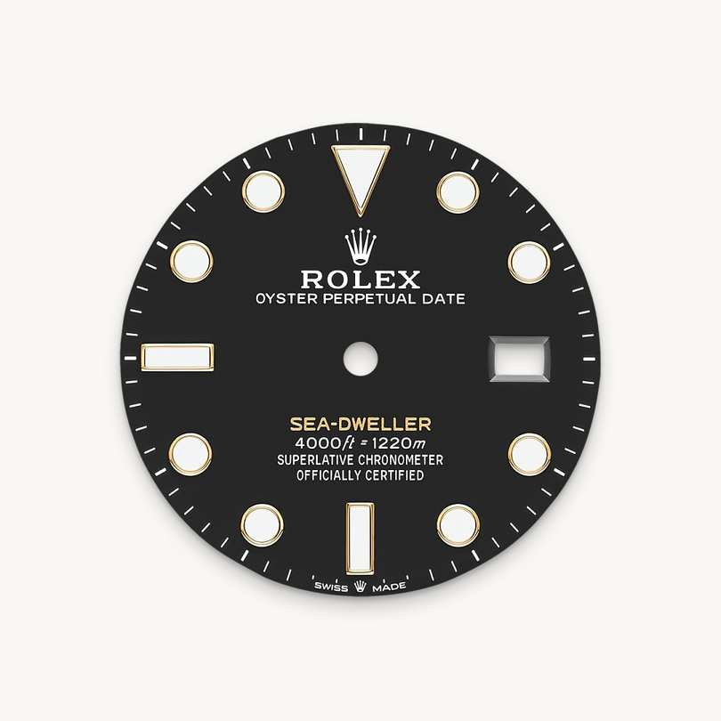 The black dial of the Sea-Dweller has the large hands and indices reserved for Rolex professional models. The dial bears the name Sea-Dweller inscribed in a yellow hue, echoing the colour of the yellow gold. When the Sea-Dweller was updated in 2017, this lettering was in red, in reference to the original model. The innovative Chromalight display on the dial pushes back the boundaries of visibility in dark environments. Its distinctive blue glow lasts up to eight hours with a uniform luminosity, practically twice as long as that of standard luminescent materials.