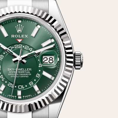 The Rolex fluted bezel is a mark of distinction. Originally, the fluting of the Oyster bezel had a functional purpose: it served to screw the bezel onto the case, helping to ensure the waterproofness of the watch. It was therefore identical to the fluting on the case back, which was also screwed onto the case for waterproofness, using specific Rolex tools. Over time, the fluting became an aesthetic element, a genuine Rolex signature feature. Today the fluted bezel is a mark of distinction, always in gold. The Sky-Dweller is equipped with a mechanism of interaction between the rotatable bezel, the winding crown and the movement: the Ring Command system, which allows the user to select the watch's functions one-by-one and to set them easily, quickly and securely.